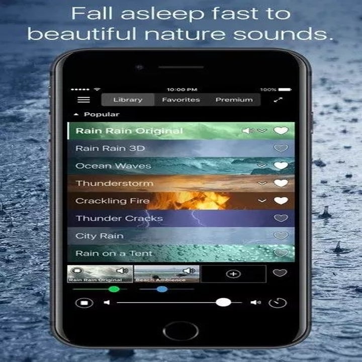 17. An app called Rain Rain so you can focus on the lull of soothing thunderstorms and finally discover what it's like to be well-rested. It has over ~100~ options, like soft leaves in the wind, rain on the tent, or crackling fire to help you tune out everything but your pillow and heavy eyelids.