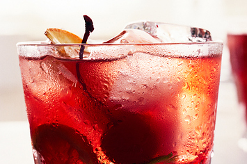 Sugar cubes + bitters + lemon wheel + lime wheel + orange wheel + maraschino cherry + grenadine + rye whiskey + clud soda + ginger ale. This is a lot fruitier and fussier than the classic Old Fashioned recipe, but it's good. Get the recipe.