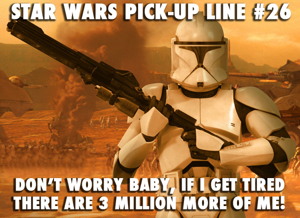 This post has not been vetted or endorsed by BuzzFeed's editorial staff. BuzzFeed Community is a place where anyone can create a post or quiz. Try making your own!Buzz·Posted on Feb 14, 2012Star Wars Pick-Up Lines (Vol. 2)Even more pick-up lines from a galaxy far, far away!by erikac4Community ContributorFacebookPinterestTwitterMailLink Star Wars Pick-Up Lines comediva.com See all 30 Star Wars Pick-Up Lines at Comediva.com!