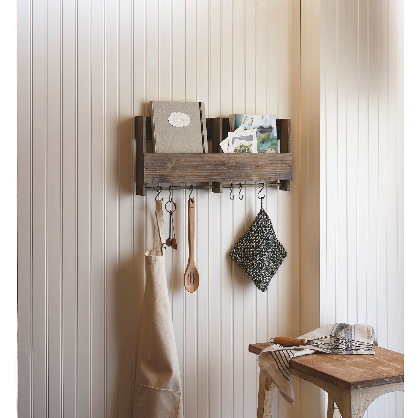 12. A rustic wooden shelf with S-hooks that just looks like cute country decor, but will actually save you from misplacing your keys (again).
