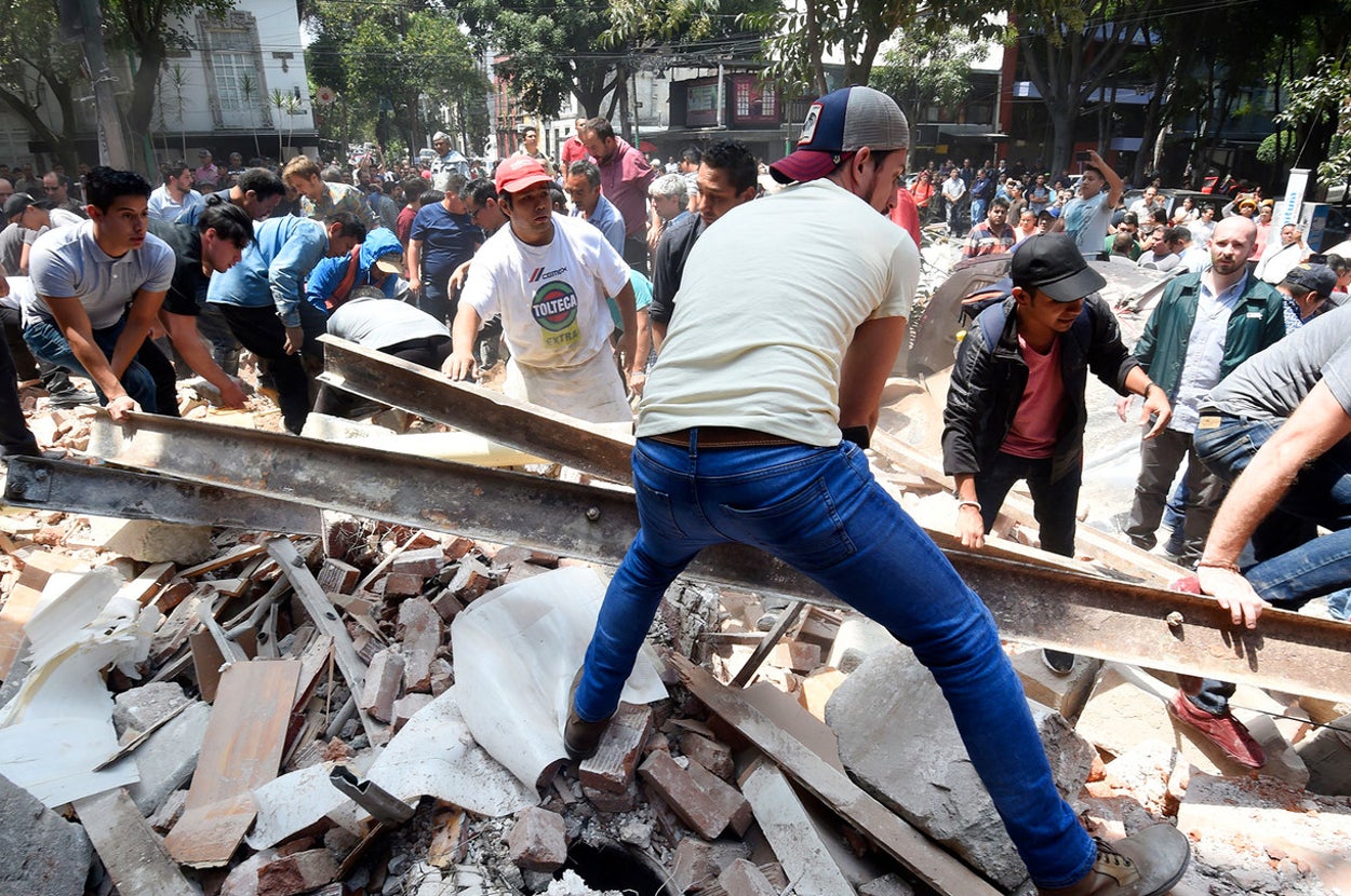 Personas buscan sobrevivientes en un edificio que colapsó en la Ciudad de México.