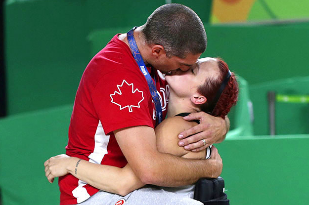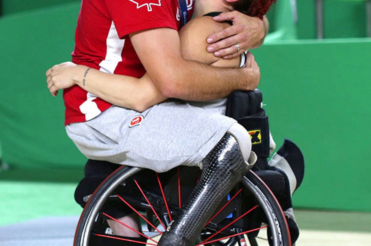 Canada's Adam Lancia of the men's wheelchair basketball team kisses his wife, Jamey Jewells, of Canada, after her basketball match during the 2016 Paralympics in Rio de Janeiro.