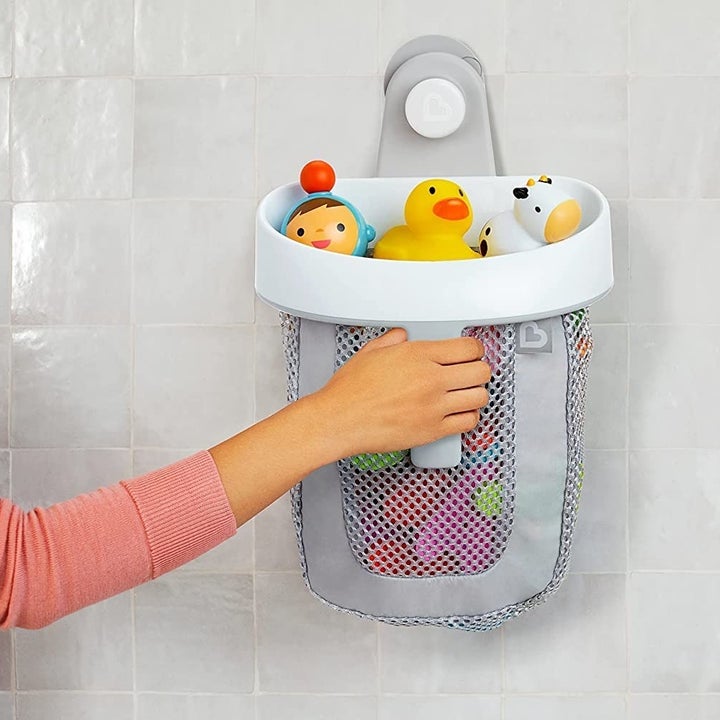 1. This genius quick-drying mesh bath toy holder for scooping up your kiddo's toys with ease and hanging the basket up on the included mounting disc.
