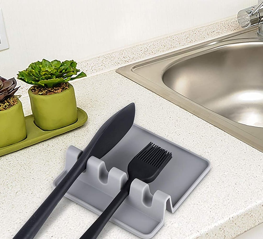 15. This silicone utensil rest with a drip pad, so you can put cutlery and cooking tools down between stirring and flipping your food in the pan without worry of sauce and crumbs getting on the counter or floor.