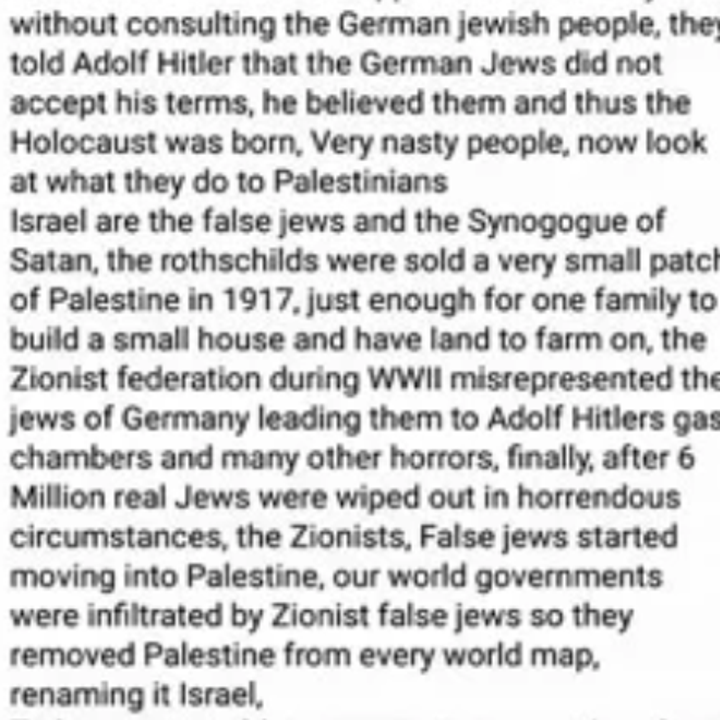 The screenshots referred to by the party include posts making claims that “history books are a lie, Adolf Hitler saw the zionist false Jews infiltrating governments across Europe”, and that “zionists were partly responsible for the holocaust.”