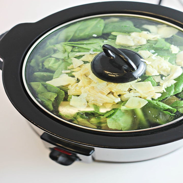 Canned artichoke hearts, spinach, garlic, and three kinds of cheese get tossed in the slow cooker until they become one seriously creamy dip. Serve with crudités, pita chips, or even naan for dunking. Get the recipe for spinach-and-artichoke dip here.