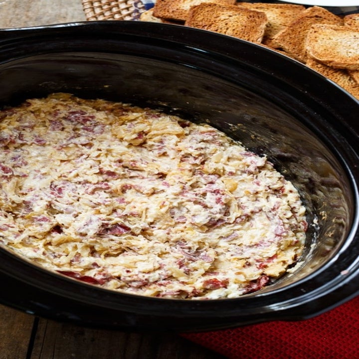 The only work you have to do is caramelize the onions on the stove top. Then add them to the slow cooker with cheese, sour cream, milk, and spices and wait for your party dip to cook itself. Get the recipe for hot caramelized onion dip here.