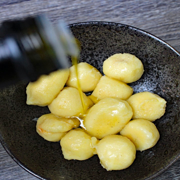 I heated a little olive oil in a skillet and tossed the gnocchi in it for about a minute. Then, I added four tablespoons of water, covered the skillet, and let the gnocchi cook for four more minutes. By that time, the gnocchi were defrosted and just slightly squishy.