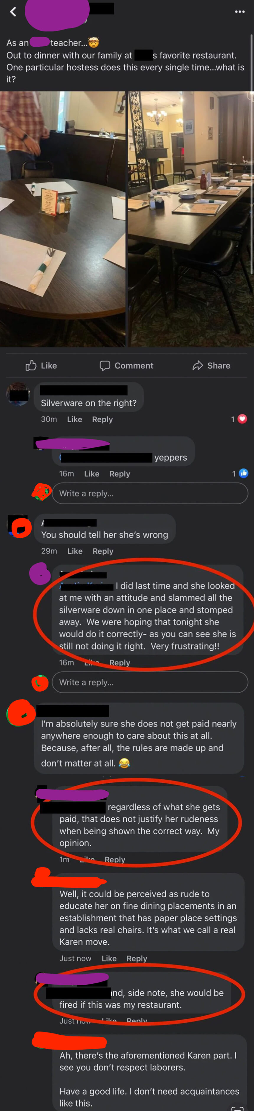 This Karen was angry a server "placed the silverware wrong" at a casual restaurant: