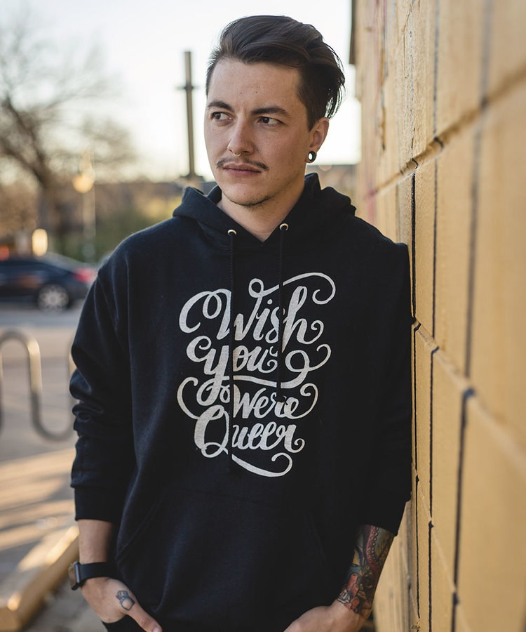 Get them from Flavnt: the "wish you were queer" hoodie for $39.99 (available in sizes S–3X), the "bi bi bi" shirt for $24.99 (available in sizes XS–2X and multiple styles), or the "be who you needed when you were younger" shirt for $34.99 (available in sizes XS–2X and multiple styles).
