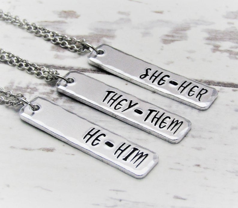 31. A they/them, she/her, he/him necklace so you can wear your pronouns with pride!
