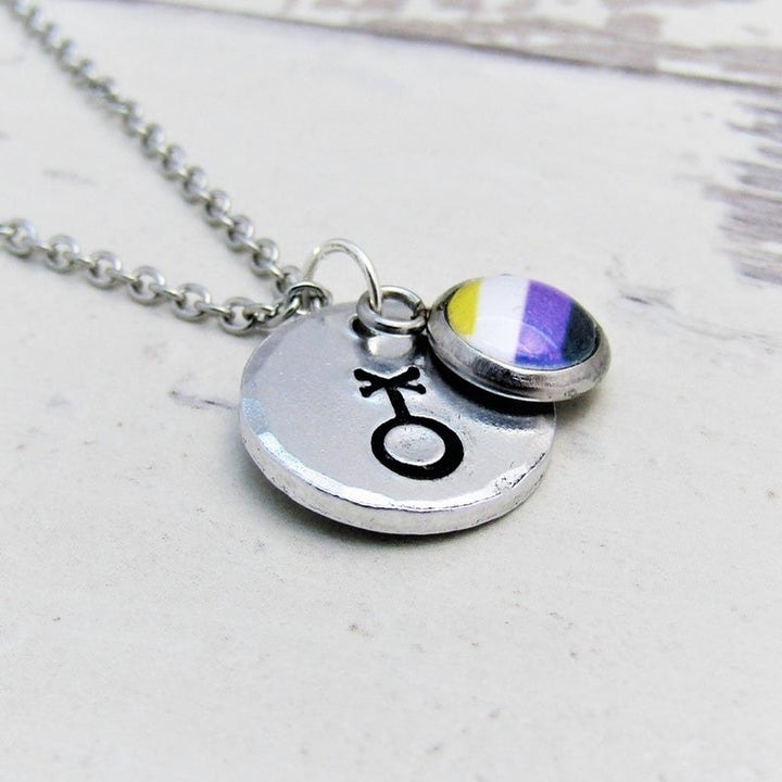 Get them from Pride Asylum on Etsy: the pronoun necklace for $14.74 (available in four sizes and six pronoun options) or the non binary pride necklace for $14.74 (available in four sizes).
