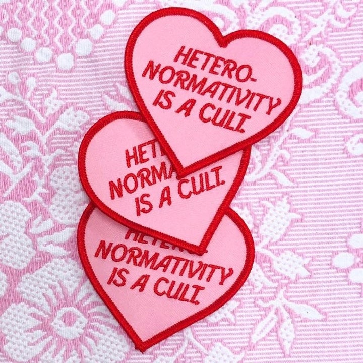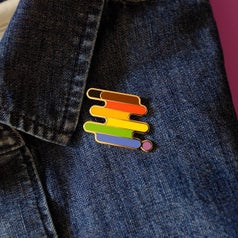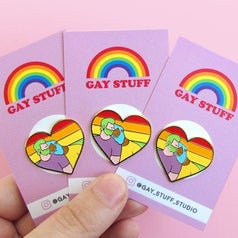 Get them from Gay Stuff Studio on Etsy: the queer/lesbian pin for $12, rainbow heart pride pin for $13, or the queer/gay pin for $11.