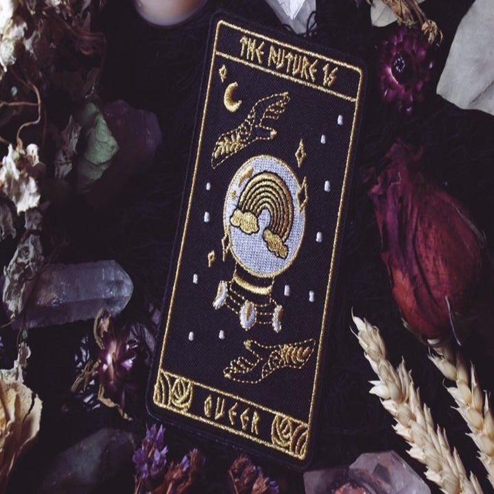 Get them from grrrlspells on Etsy: the queer magic pin for $7.70 or the future is queer patch for $7.70.