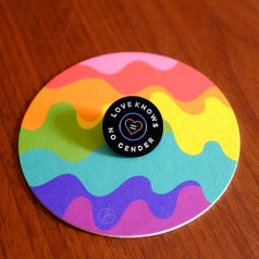 Get them from Bianca Designs Co on Etsy: the LGBTQ+ Pride Sticker Pack for $8, the "love knows no gender" pin for $8, or preorder the disability pride pin for $10.