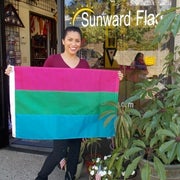 Get them from PrideFlagSD on Etsy: the bisexual pride flag for $30, trans pride flag for $30, eight-stripe rainbow pride flag for $40, pansexual pride flag for $25, or polysexual pride flag for $25 (all flags are 3'x5', but custom sizes are available).