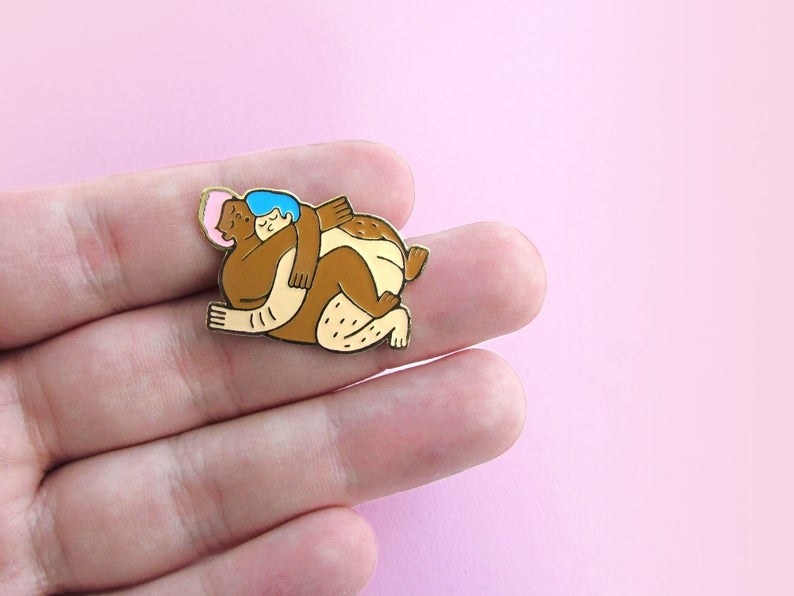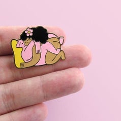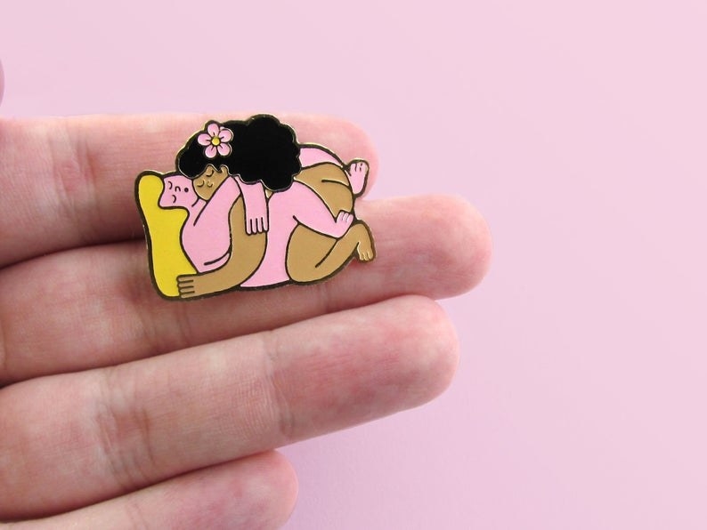 9. A lapel pin, because every denim jacket is sentient and wants to be adorned with depictions of queer love-making — it's canon.