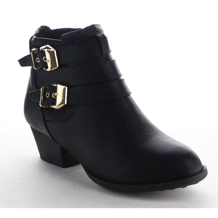 Faux leather boots with sweet buckle details and a practically nonexistent heel for smooth travels.