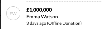 Watson's donation is the first one on the crowdfunding page for the newly launched Justice and Equality Fund and was made three days ago.