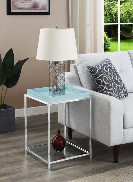 14. Or a glam end table that's fashioned with a removable tray top, so you can use it to show off favorite mementos or easily remove it for cleaning after a wild party (watching Squid Game and eating an entire block of cheddar counts as a "wild party," right?).