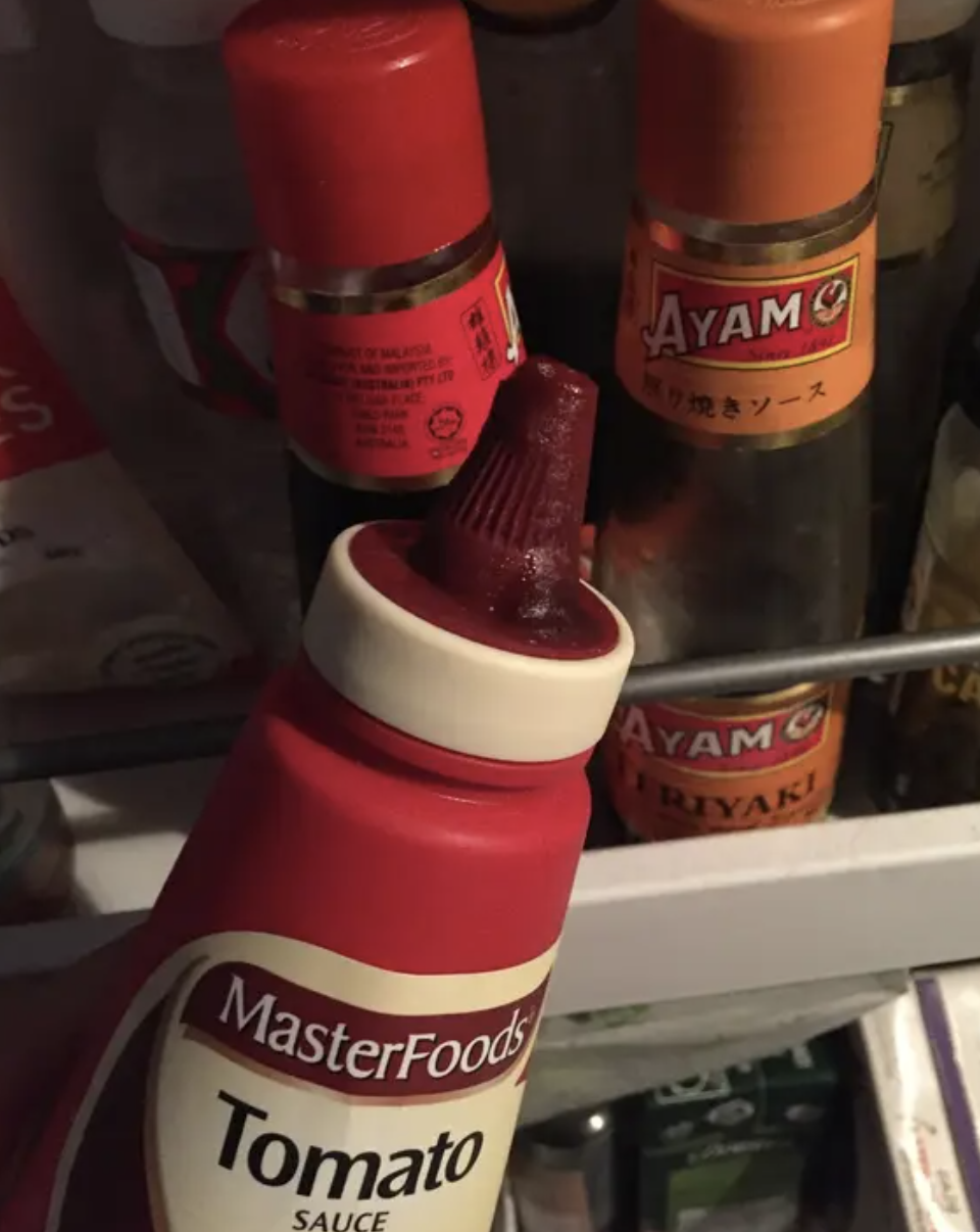 Tomato sauce with a partially clogged nozzle so the sauce squirts out at weird angles.