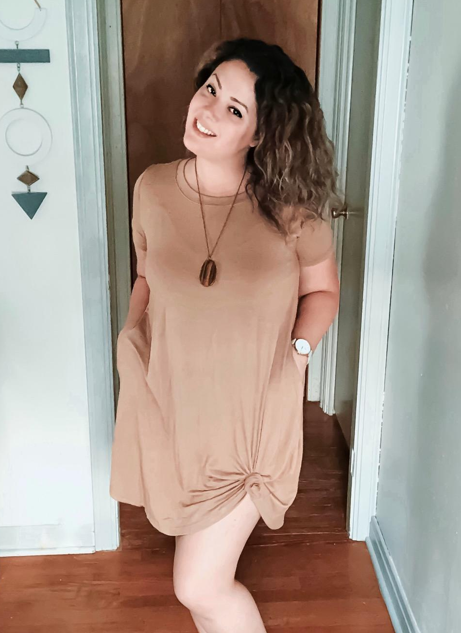 "This dress is amazing! The fabric is so soft and silky but also has structure and because the sides are ruched, I can adjust it to the perfect length, which means a lot when you're only 5'1". The ruching allows me to control the amount of fabric gathered in the tummy and behind areas. To sum it all up, I LOVE the dress and plan on purchasing at least two more in the army green and the brown because this style dress can also be worn in the fall and spring months with a basic or colored denim jacket and a cute pair of boots or booties!" —Tonya
