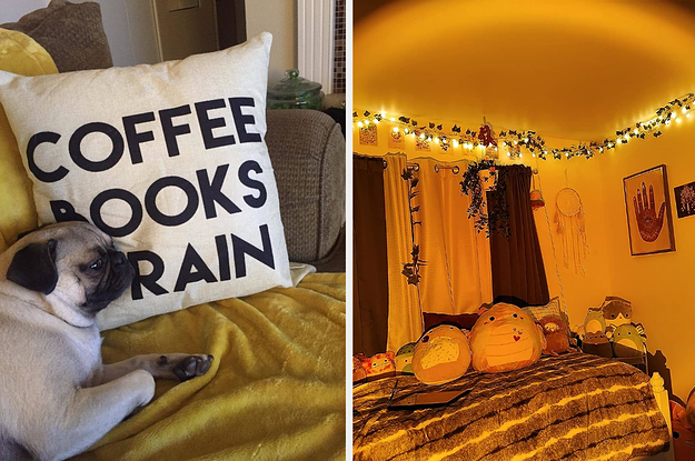 8. And pair them with a decorative pillow cover stating just a few of the coziest things ever: coffee, books, and rain. Looking at it *might* just inspire you to sit down and finish reading that novel you've been working your way through forever.