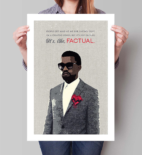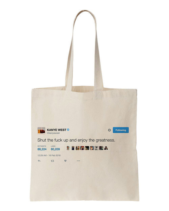 Buzz·Posted on 13 Mar 201617 Etsy Items Kanye Would Definitely Purchase For Himself###hashtag all positive vibes.by Jenna GuillaumeBuzzFeed Staff, AustraliaFacebookPinterestTwitterMailLink 1. This totally necessary Kanye doll. 2. These custom Kanye socks. 3. This beautiful tweetstorm mug. 4. These his and hers keyrings. 5. This print to remind yourself of your creative genius. 6. This reminder to (not) smile. 7. This campaign cap. 8. And these campaign stickers. 9. This celebratory card. 10. This important print. 11. This special way to tell someone you love them. 12. And this golden mug version. 13. These stickers that will show people what you really think of them. 14. This handy bookmark reminder. 15. This perfect tote. 16. This happy mug. 17. And this message to everyone to not interrupt your important work.