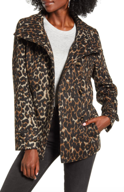6. A double breasted peacoat with your favorite leopard print to keep you smiling even on a rainy day.