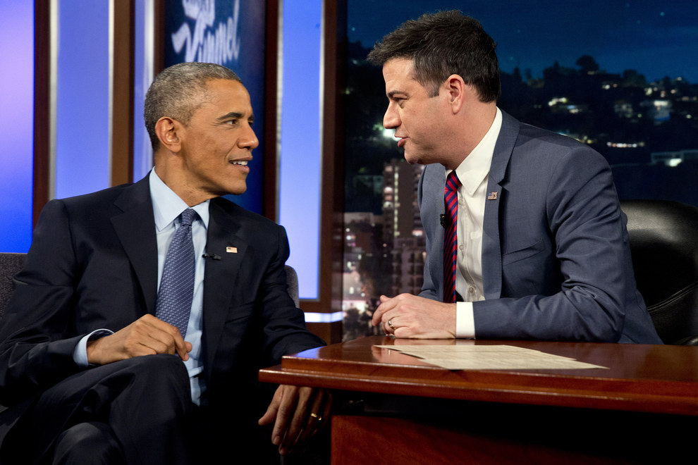 President Obama talks with Jimmy Kimmel during a break in taping. Jacquelyn Martin / AP
