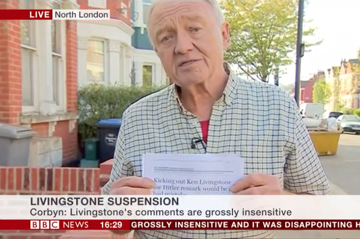 "Look at this, this is last week's edition of the Jewish News," Livingstone said in an interview on the BBC News channel, holding up a printout of a piece headlined 'Kicking out Ken Livingstone for Hitler remark would be a bad mistake'.
