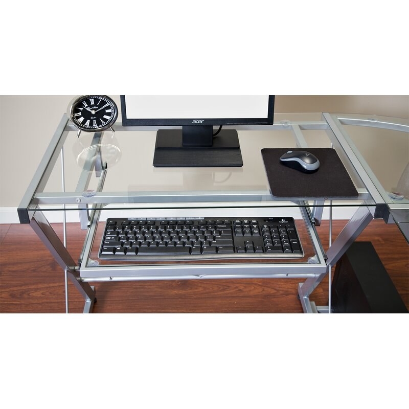 12. A steel-frame, tempered glass L-shape desk with a CPU stand for desktops and a pullout glass tray that fits any keyboard for your home office of the future (today!).