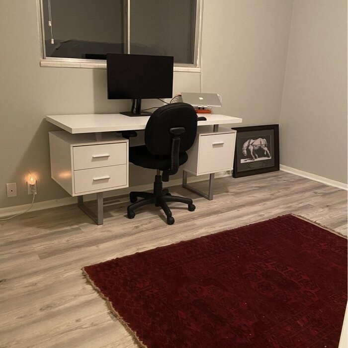 Promising review: "Perfect amount of table space and storage, perfect amount of sturdiness, perfect look. Can easily fit in a small bedroom (even by NYC standards). It doesn't stain easily or get bubbles (I have spilled plenty of water and coffee on it thanks to my Keurig machine, and the desk still looks brand-new). The only downside is that it was a bit difficult to assemble, especially when attaching the legs to the tabletop. In particular, make sure the screws are perfectly in place. Still totally worth it though." —Devi from Brooklyn, NY