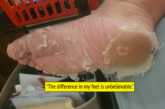 8. A foot peel mask that'll unearth a pair of smooth, soft feet hiding beneath layer after layer of dry and cracked dead skin and calluses — no painful scrubbing necessary! Just cut a hole in the booties, slip your feet in, and let it do its thing!