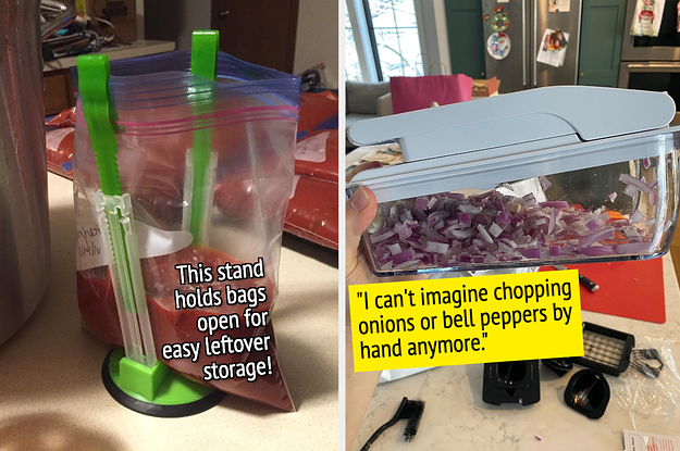 1. Clip-on bag stands so you can say goodbye to struggling to hold a Ziploc bag open with one hand and attempting to pour leftovers in with the other without making a big mess. That song and dance ends NOW.