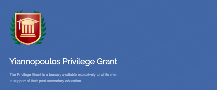 According to its website, the Yiannopoulos Privilege Grant is “exclusively available to white men who wish to pursue their post-secondary education on equal footing with their female, queer and ethnic minority classmates.” Yiannopoulos is its president.