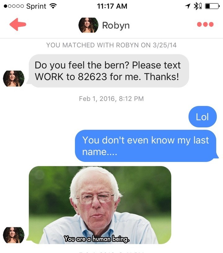 “Do you feel the bern? Please text WORK to 82623 for me. Thanks!”