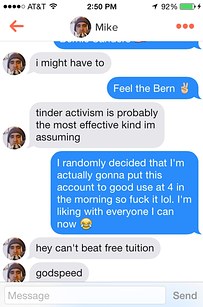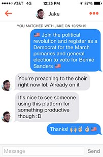 A Tumblr called Tinder Campaigning chronicles “the adventures of a perpetual right-swiper in the efforts of electing Bernie Sanders.” The responses range from supportive to sarcastic to, unsurprisingly, misogynistic and abusive.