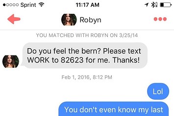 While the Tindercorps is committed, it’s hard to tell if their efforts have garnered any more support for Sanders. Gedrich said that — on top of the standard-issue Tinder vulgarity and a few accusations of being a bot — several of her matches told her they planned to vote for Donald Trump. And just today, Tinder banned Gedrich; she had been reported too many times.