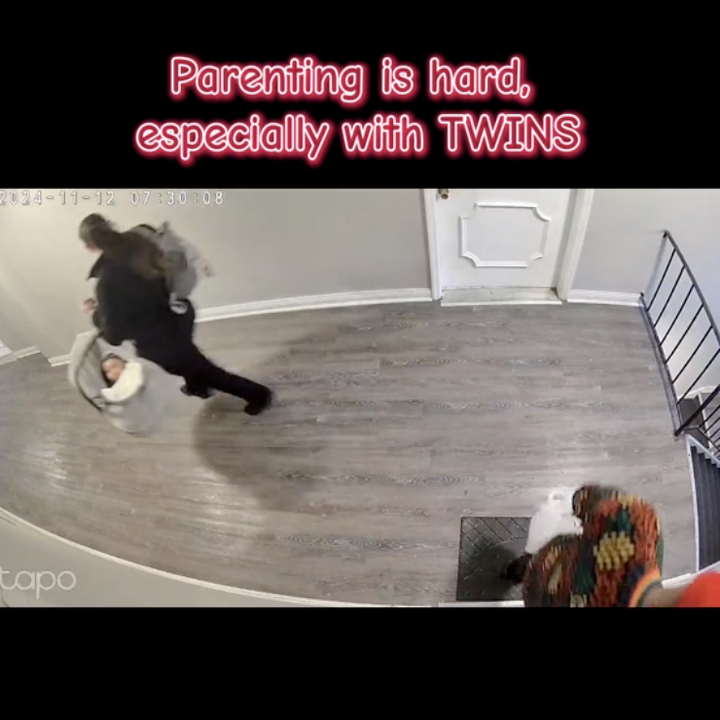 双子と一緒に外出した夫婦……。玄関先の防犯カメラの映像が話題です。