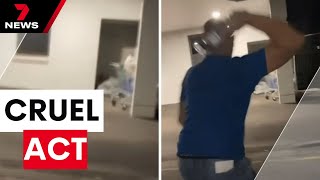 現地テレビ局 7NEWSが入手した映像には、女性に向かってガラス瓶を投げつける様子などが記録されている。