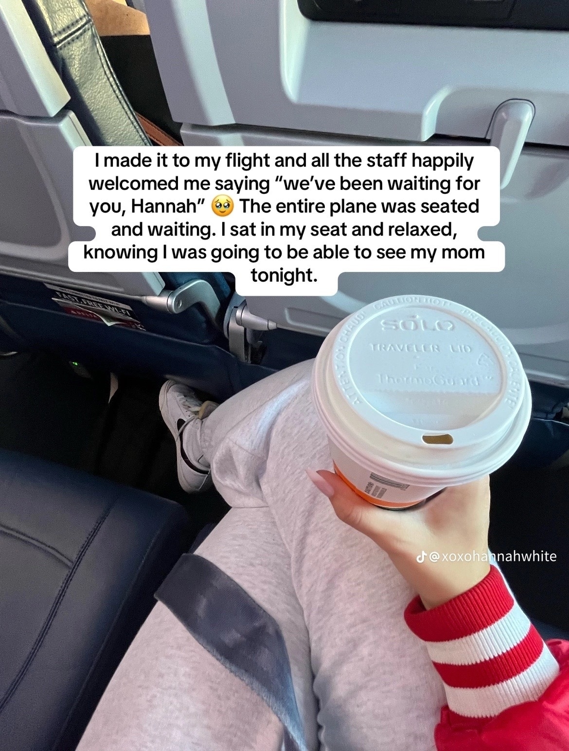 ミネアポリスで無事、乗り継ぎの飛行機に間に合ったというハンナさん。乗り込むと、ハンナさんのためだけに他の乗客は30分も待機してくれていたそう。