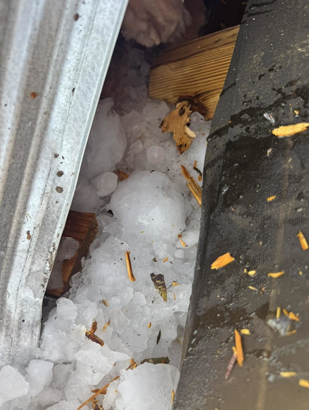 写真からは、真っ白な雹(ひょう)ほどの大きさの塊が、屋根部分や敷地内に残っているのが確認できる。