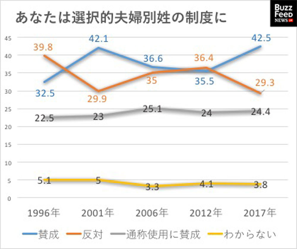 内閣府の2017年12月の「家族法制に関する世論調査」では、「夫婦がそれぞれ婚姻前の姓を名乗れるように法律を改めてもかまわない」(選択的夫婦別姓に賛成)と答えた人が42.5%と過去最高になった。反対は29.3%だった。