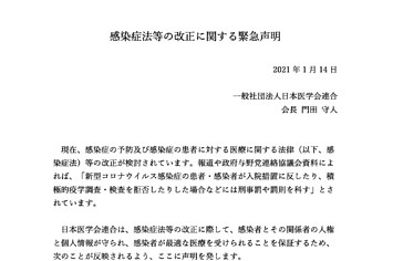 新型コロナウイルスの感染者が入院や検査を拒否した場合などに罰則を設ける法改正が検討されていることについて、日本医学会連合や日本公衆衛生学会、日本疫学会が揃って反対の声明を出した。