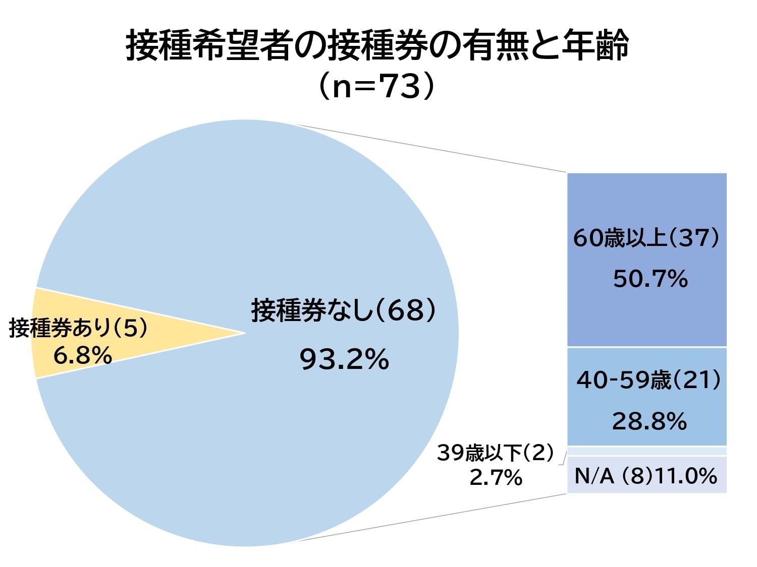 接種したいと答えた73人に接種券の有無を聞いたところ、9割以上にあたる68人が「接種券がない」と答えた。