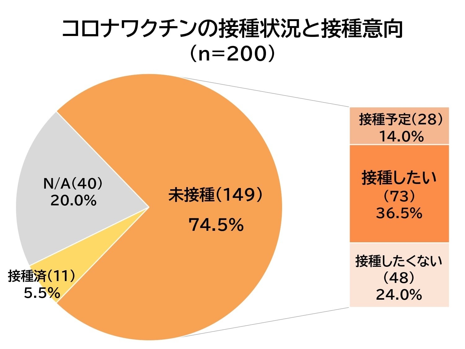 未接種の149人中28人が「接種予定」(予約済・予約予定)で、73人は「接種したい」、48人は「接種したくない」だった。