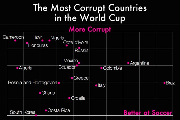 Sports·Posted on Jun 20, 2014The Most Talented And Corrupt World Cup NationsBrazil, Argentina, Colombia, and Italy lead the pack. Based on Transparency International's Corruption Perceptions Index and the (pre-Cup) World Football Elo Ratings.by Jeremy Singer-VineBuzzFeed News Data EditorFacebookPinterestTwitterMailLink