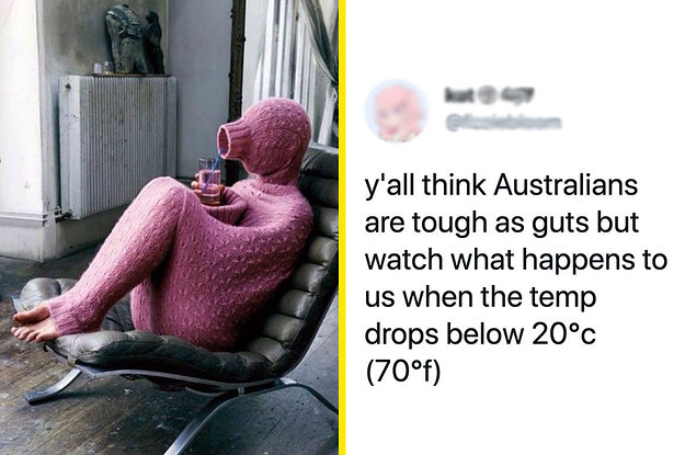 y'all think Australians are tough as guts but watch what happens to us when the temp drops below 20°c (70°f)