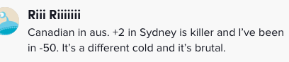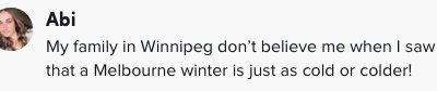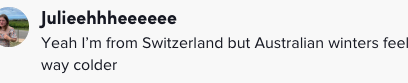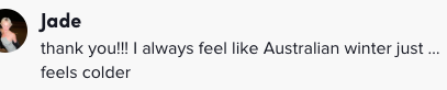 In the comments, Aussies were ecstatic to hear a non-Australian — not to mention, one who grew up in LEGIT cold temps — acknowledge just how rubbish the winters can get here.